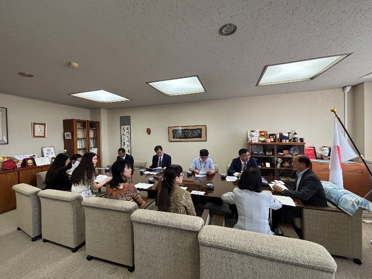 まず、学長室で表敬訪問が行われ、本学の学習システムに関して活発な意見交換が行われたほか、日本の教育制度についての質問がなされた。授業運営における工夫や課題などについて、活発な議論が交わされ、双方にとって参考となる情報交換の場となった。