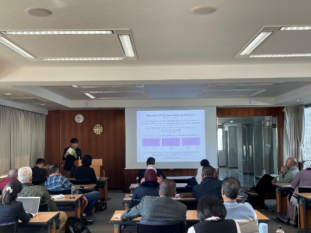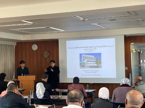 はじめに、西研究棟8Fラウンジにて芝﨑教授が放送大学の概要をお話ししました。その後、安池教授によるオンライン教育や実際の講義動画等の説明がアラビア語も記載された資料を用いて行われました。アラビア語通訳も付いていたため、質疑応答の時間では研修生から活発な質問がなされ活気ある講義となりました。