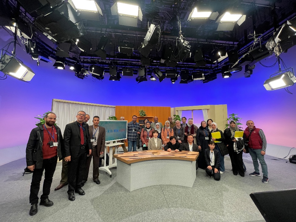 はじめに、苑教授、青木教授、小二田准教授が出席し、来訪者との意見交換を行いました。意見交換では、お互いの大学での教育の現状や特色、授業運営における工夫や課題などについて、活発な議論が交わされ、双方にとって参考となる情報交換の場となりました。その後、OUJミュージアムや制作スタジオへの施設見学を実施いたしました。OUJミュージアムでは、本学の放送授業がこれまでどのように発展してきたか、またその歩みに関する詳細な説明を行いました。続く制作スタジオでは、実際の撮影セットを使った記念撮影も行い、来訪者の皆様にも非常に楽しんでいただけました。全体を通じて、お互いの大学の取り組みや状況について活発な意見交換が行われ、今後の更なる交流と協力に向けて、とても有意義な時間となりました。