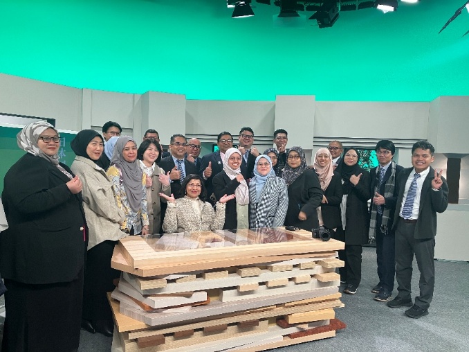 OUM(マレーシア公開大学)から27名の来訪がありました。はじめに、制作スタジオの施設見学を行い、実際の撮影現場で説明を聞き、撮影セットの中で講義体験、記念撮影を行いました。その後、図書館の施設見学をし、仁科図書館長による展示図書や図書館に関する説明がありました。その後館内を自由に見学し、図書館設備の大きさ、設備の充実度に感銘を受けている様子でした。