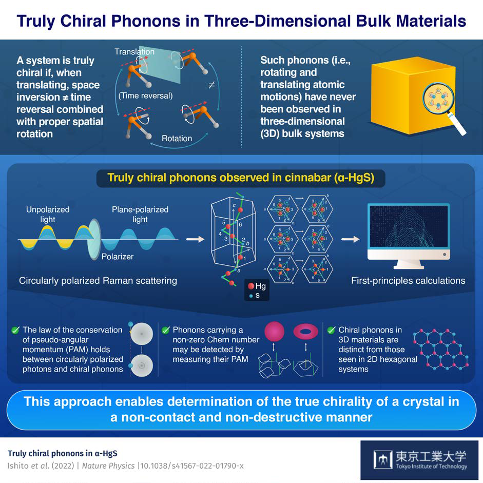 Chirality can be true or false, depending on the symmetry of dynamic propagation. Crystal lattice vibrations, called phonons, can also display chirality as has been shown in some two-dimensional structures. However, truly chiral phonons have never been observed in three-dimensional systems—that is, until now. Researchers from Tokyo Tech have identified these for the first time, in bulk cinnabar. Utilizing pseudo-angular momentum, their method can be used to identify the chirality in crystalline structures.